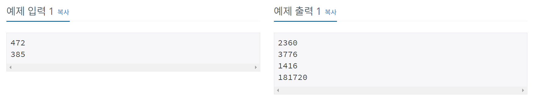 첫째 줄에 (1)의 위치에 들어갈 세 자리 자연수가, 둘째 줄에 (2)의 위치에 들어갈 세자리 자연수가 주어진다.
