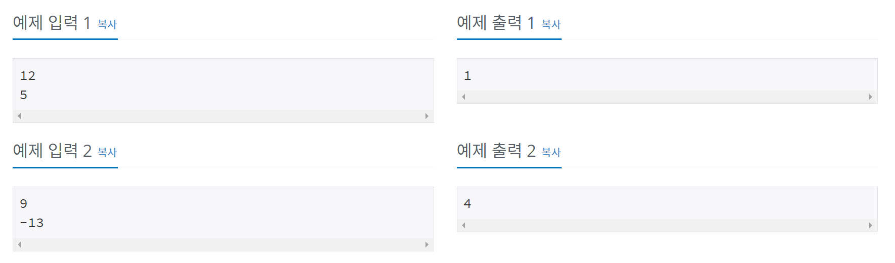 - 첫 줄에는 정수 x가 주어진다. (−1000 ≤ x ≤ 1000; x ≠ 0) 다음 줄에는 정수 y가 주어진다. (−1000 ≤ y ≤ 1000; y ≠ 0)