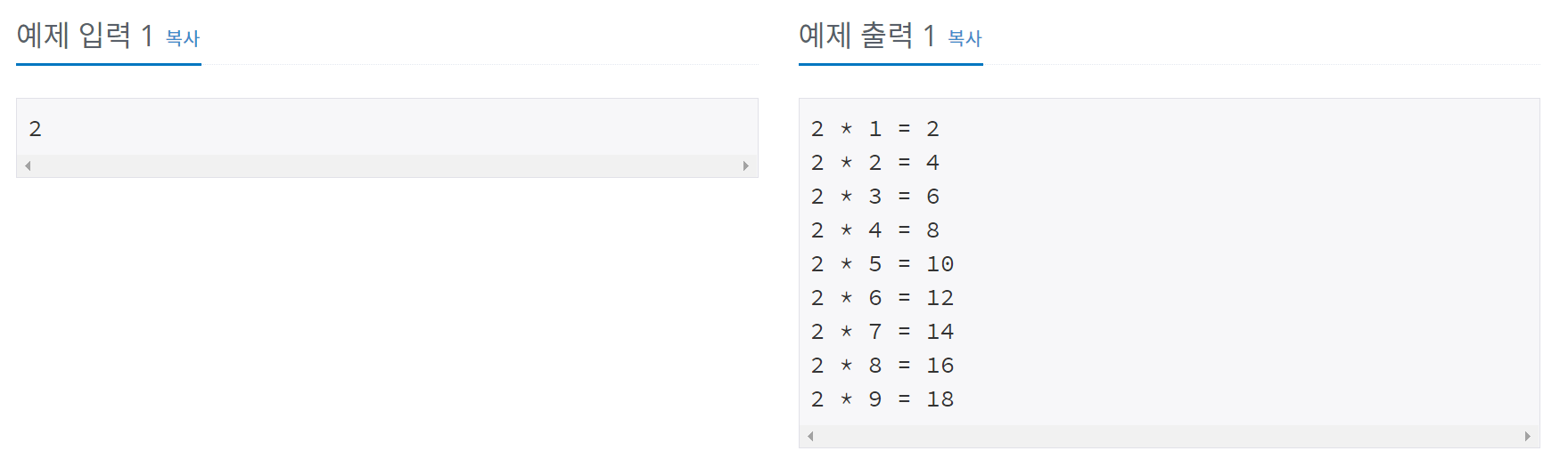N을 입력받은 뒤, 구구단 N단을 출력하는 프로그램을 작성하시오. 출력 형식에 맞춰서 출력하면 된다.