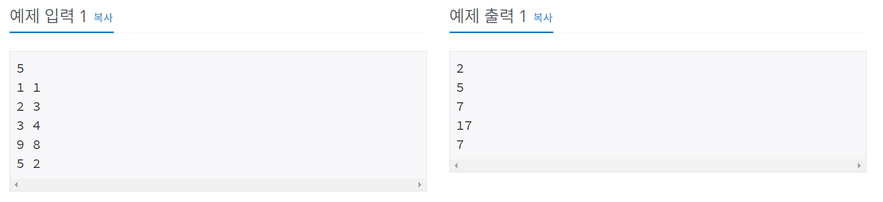 - 각 테스트 케이스마다 A+B를 출력한다.