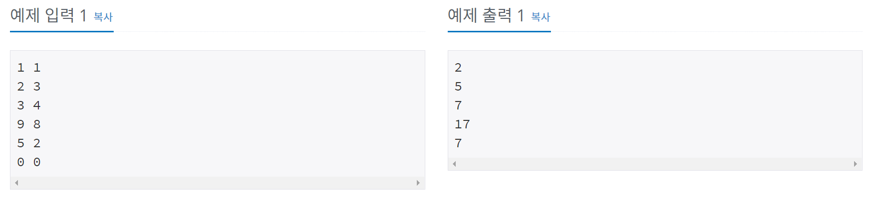 - 각 테스트 케이스는 한 줄로 이루어져 있으며, 각 줄에 A와 B가 주어진다. (0 < A, B < 10)