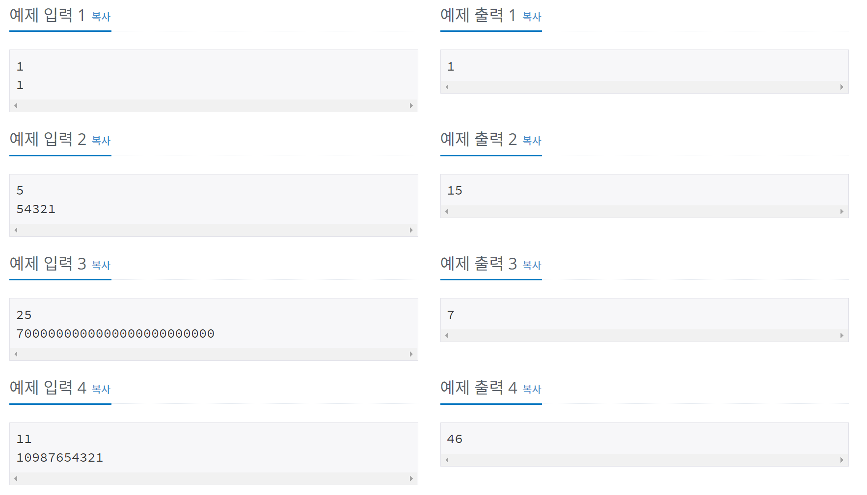 - 첫째 줄에 숫자의 개수 N (1 ≤ N ≤ 100)이 주어진다. 둘째 줄에 숫자 N개가 공백없이 주어진다.