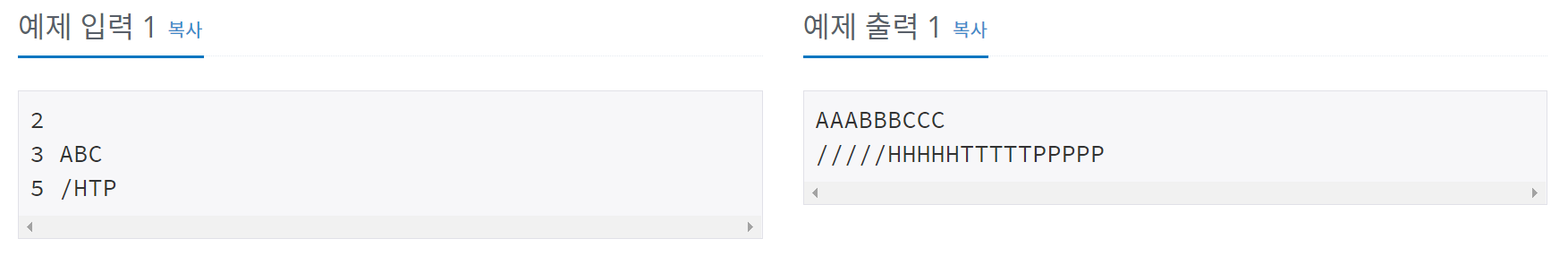 문자열 S를 입력받은 후에, 각 문자를 R번 반복해 새 문자열 P를 만든 후 출력하는 프로그램을 작성하시오. 즉, 첫 번째 문자를 R번 반복하고, 두 번째 문자를 R번 반복하는 식으로 P를 만들면 된다. S에는 QR Code "alphanumeric" 문자만 들어있다.