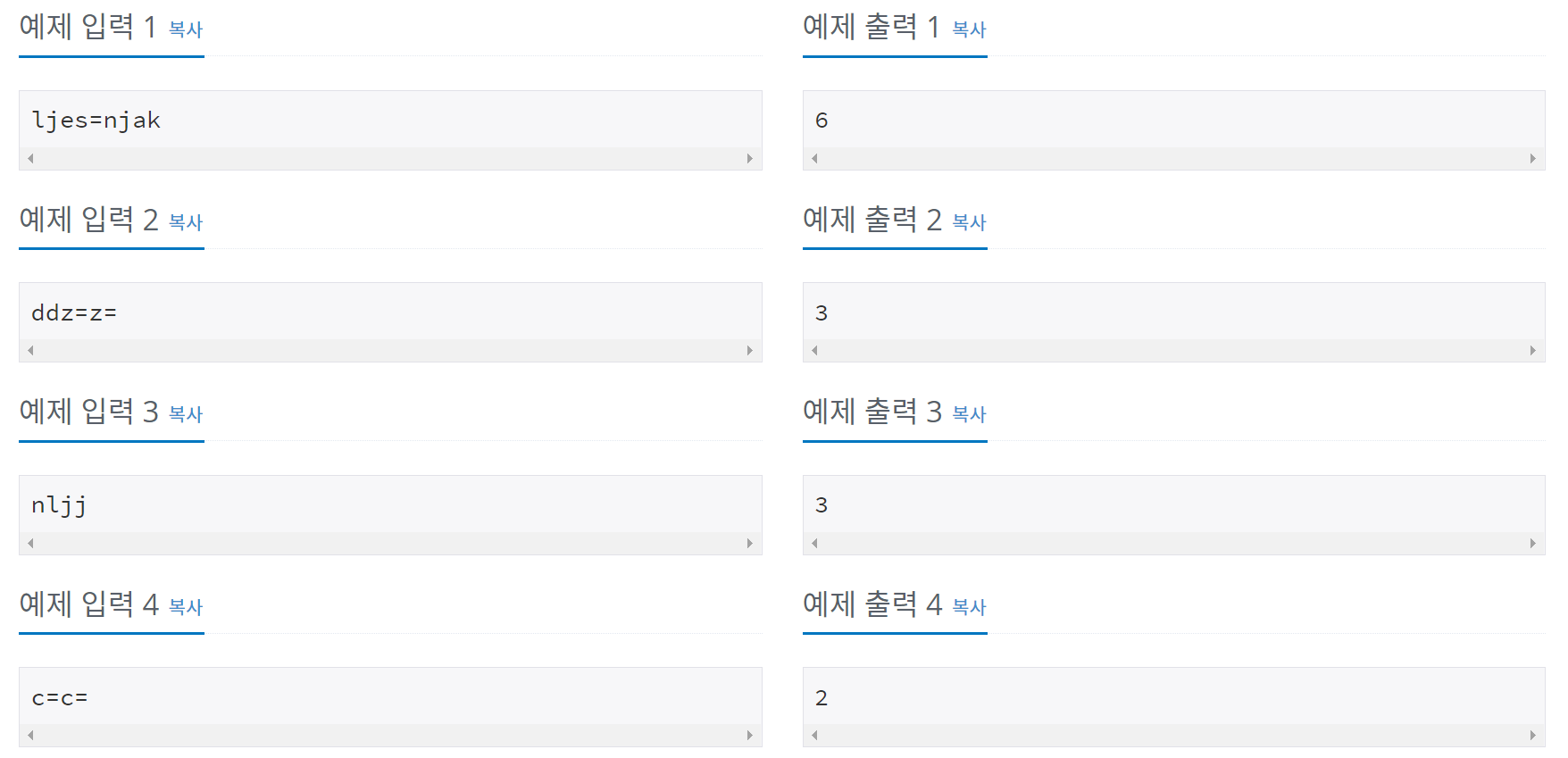 - 첫째 줄에 최대 100글자의 단어가 주어진다. 알파벳 소문자와 '-', '='로만 이루어져 있다.